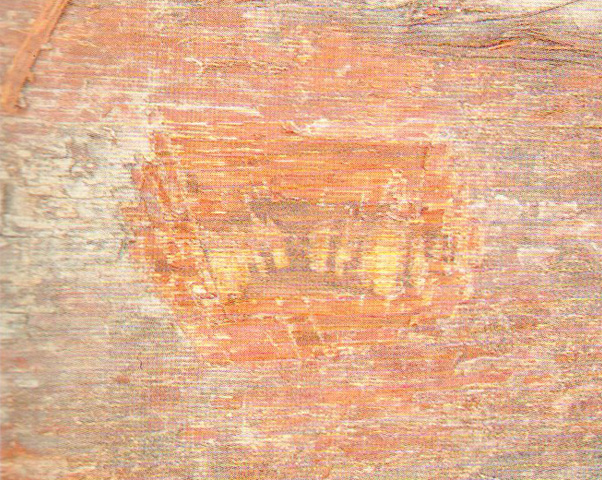 心邊材區(qū)別明顯。心材淺黃褐色,久則轉(zhuǎn)為巧克力褐色。邊材窄,金黃色。生長(zhǎng)輪略可見。