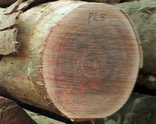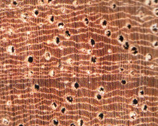 心邊材略明顯。心材暗紅褐色帶紫色調(diào),心部具不規(guī)則花紋。邊材色稍淺,寬3~4cm。生長輪略明顯,輪間界以深色組織帶。