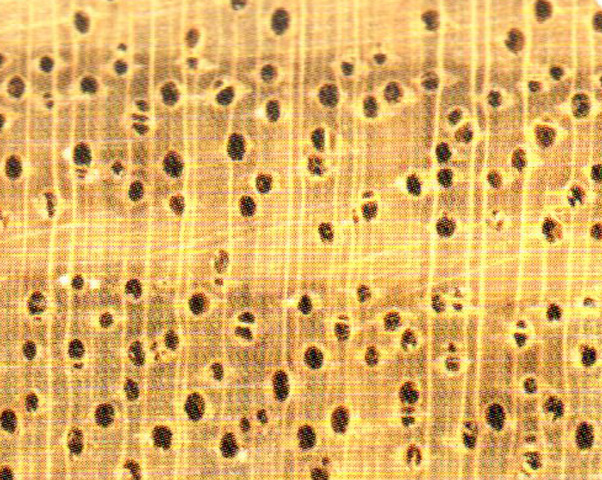 散孔材。管孔肉眼下可見略少,略大;主為單管孔,少數(shù)徑列復管孔(2~3個);具侵填體。軸向薄壁組織放大鏡下明顯,短翼狀及聚翼狀。木射線放大鏡下明顯。密度中,窄。